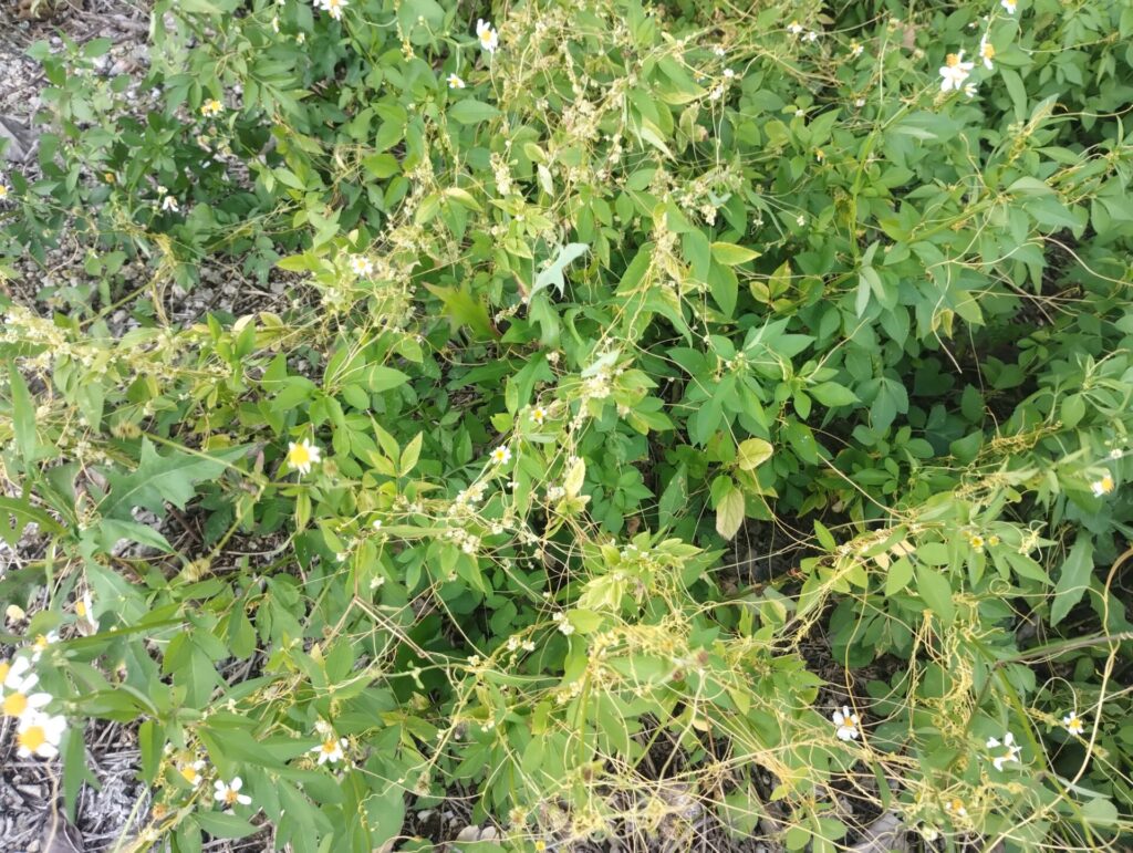 黄色い糸くずのような見た目をし、周りの植物に絡みつくように伸びるツル。