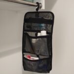 滞在中は、洗面用具に限らず、サプリメントやメガネなど、吊るしたケースにまとめて入れておきました。