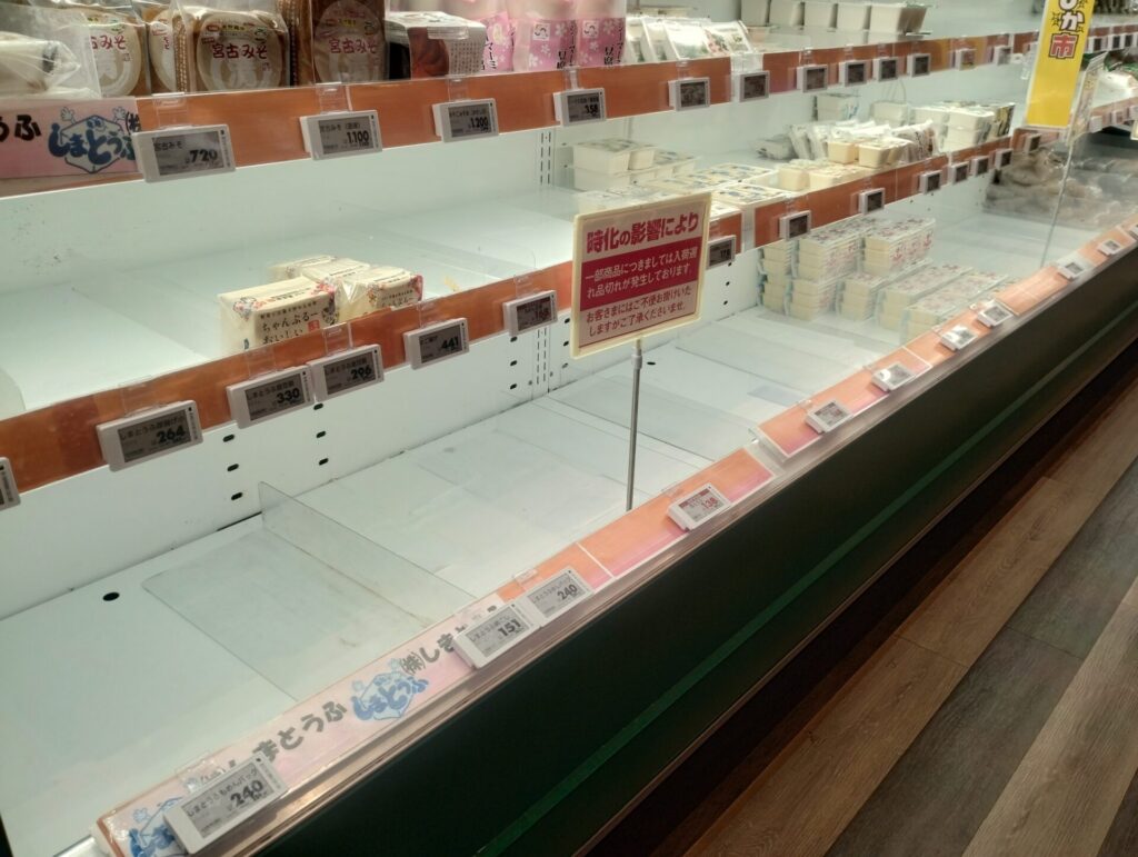 台風の影響がなくても、強風などで船の欠航は時々起こります。そんな時は、スーパーの陳列棚もご覧の通り「すっからかん」状態。