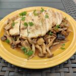 バターと醤油で作るコクと旨みたっぷりのキノコソースと、こんがり焼いた鶏肉を合わせていただきます。