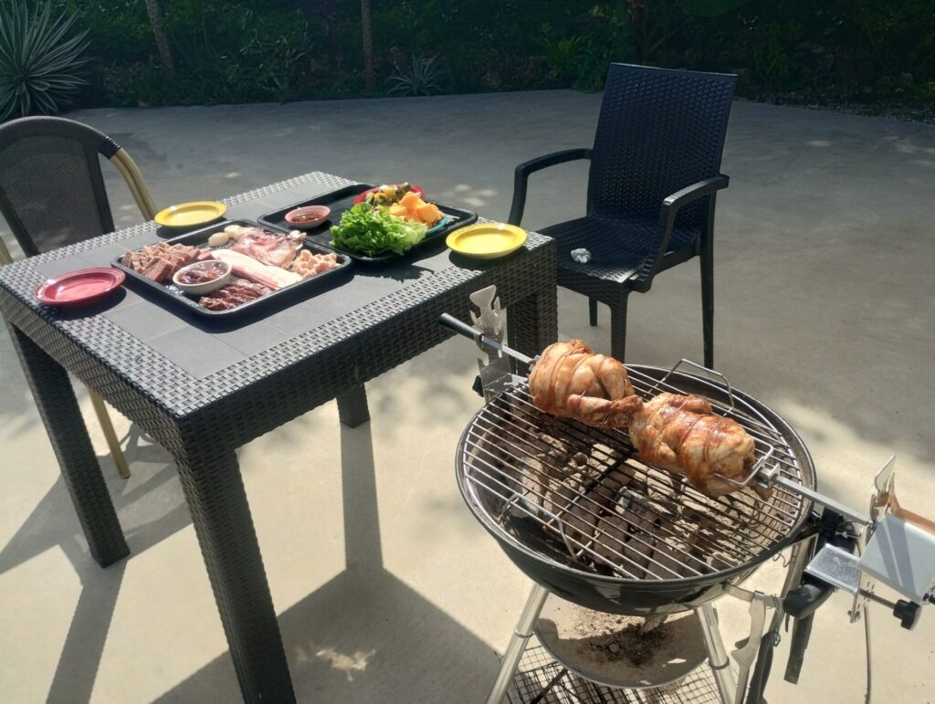 いつものように庭でバーベキューをしながら、その傍らでロティサリーチキンをじっくり焼いていきます。