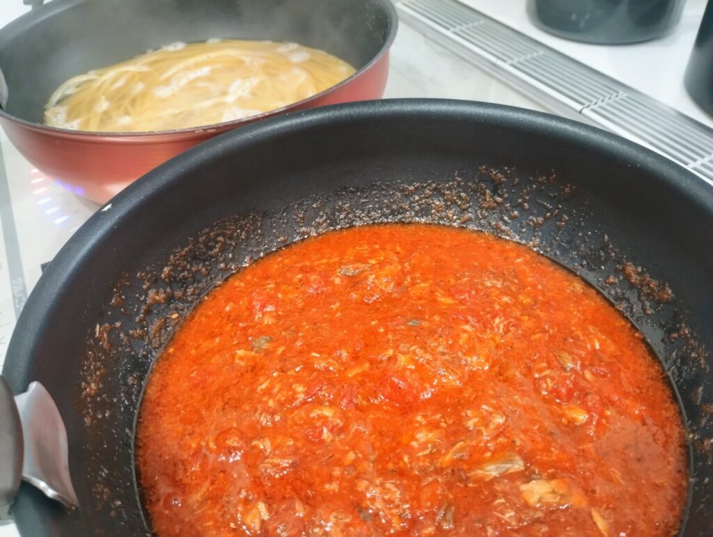 🔸ソースの水分をしっかり飛ばす(トマトとサバを合わせたら、少しとろみが出るまで煮詰めると味が凝縮されて濃厚なソースになります。)